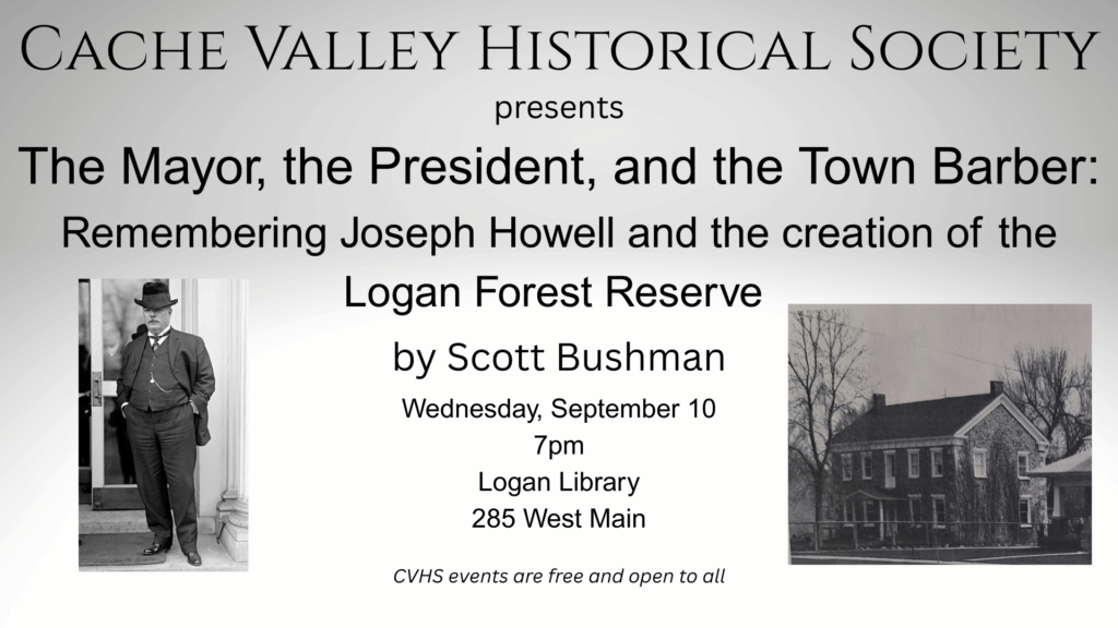 “The Mayor, the President, and the Town Barber: Remembering Joseph Howell and the creation of the Logan Forest Reserve” by Scott Bushman will be held at the Logan Library, 285 North Main Street.